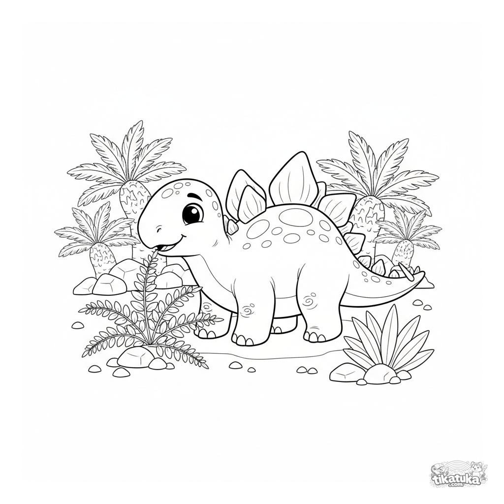 Ausmalbild für Kinder 4-6: Ein süßer Stegosaurus mit Rückenplatten knabbert an Farnen auf einer sonnigen Lichtung. Einfache, ansprechende Szene zum Ausmalen.