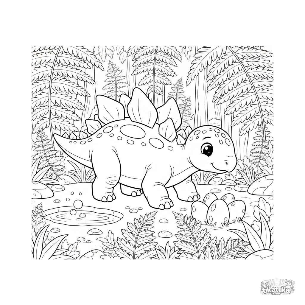 Ausmalbild für Kinder 4-6: ein freundlicher Stegosaurus mit gemusterten Rückenplatten läuft in einem prähistorischen Farnwald. Einfache Formen und klare Umrisse.