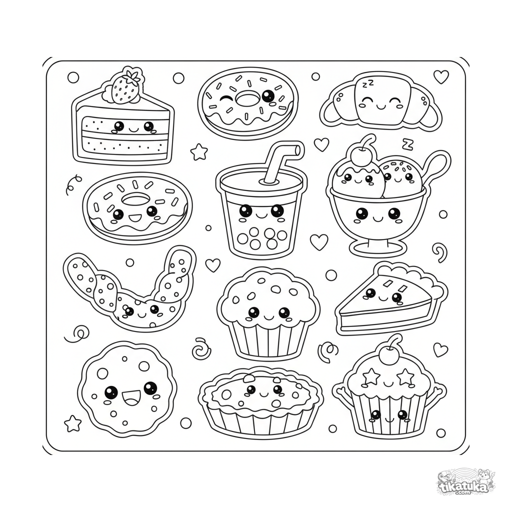 Sticker-Blatt Ausmalbild für Kinder: 12 süße Kawaii-Desserts wie Kuchen, Donut und Boba-Tee. Alle Objekte separat, perfekt zum Ausschneiden.
