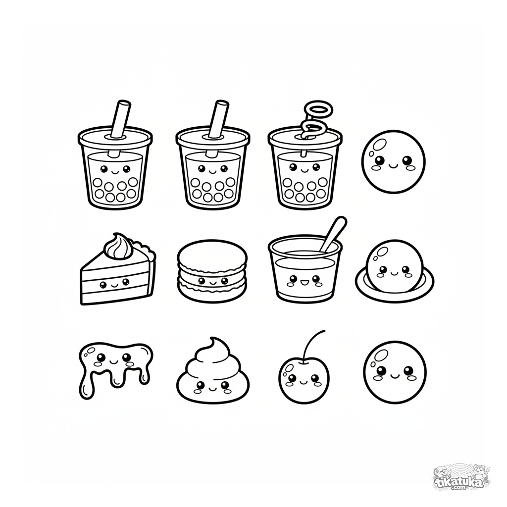 Sticker-Blatt Ausmalbild für Kinder: 12 separate süße Objekte zum Thema Boba-Getränke und Desserts. Jedes hat ein Gesicht, einfache Formen, kann ausgemalt und ausgeschnitten werden.