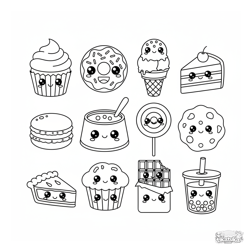 Ausmalbild im Sticker-Blatt-Design: 12 verschiedene Kawaii-Desserts wie Cupcake, Donut und Eis. Perfekt für Kinder, die Süßes lieben.