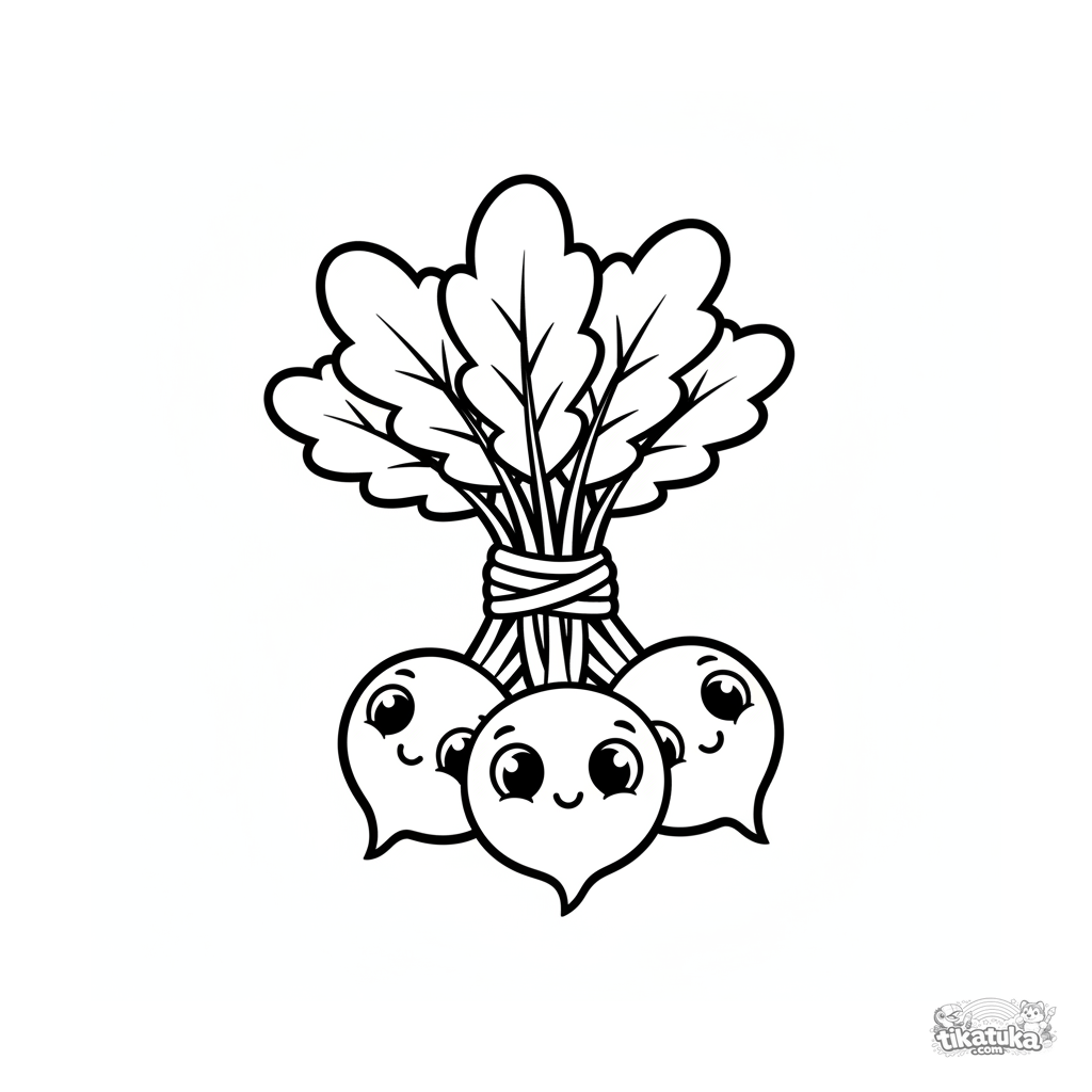 Aufkleber-Stil Ausmalbild: ein Bund frischer Radieschen. Einfaches Flachdesign für Kinder von 4-6 Jahren.