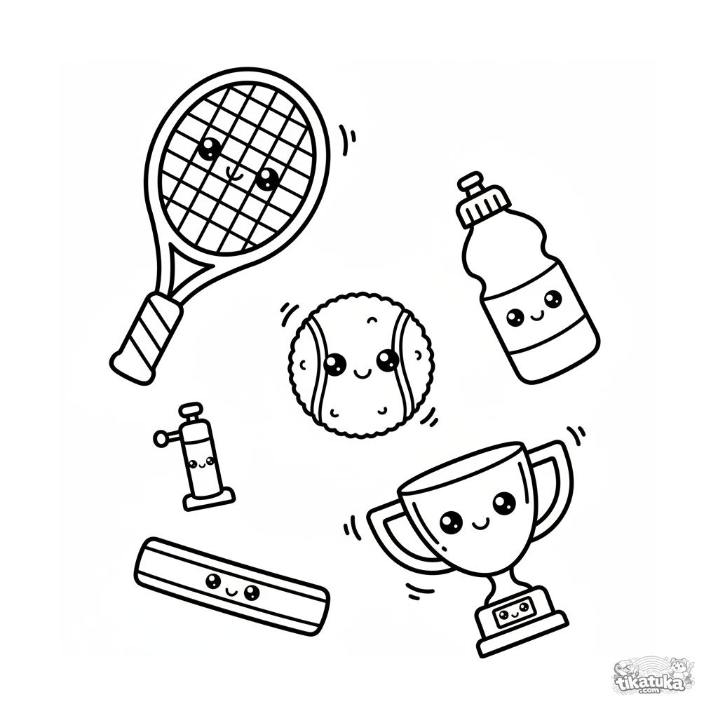 Aufkleber-Blatt Ausmalbild für Kinder von 4-6 Jahren: Einzelne Symbole der Tennisausrüstung. Klare Umrisse.