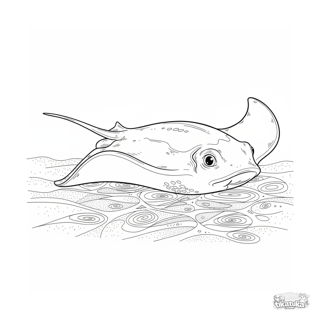 Detailliertes realistisches Ausmalbild eines Stachelrochens, der über sandigen Grund im Sonnenlicht gleitet. Für ältere Kinder.