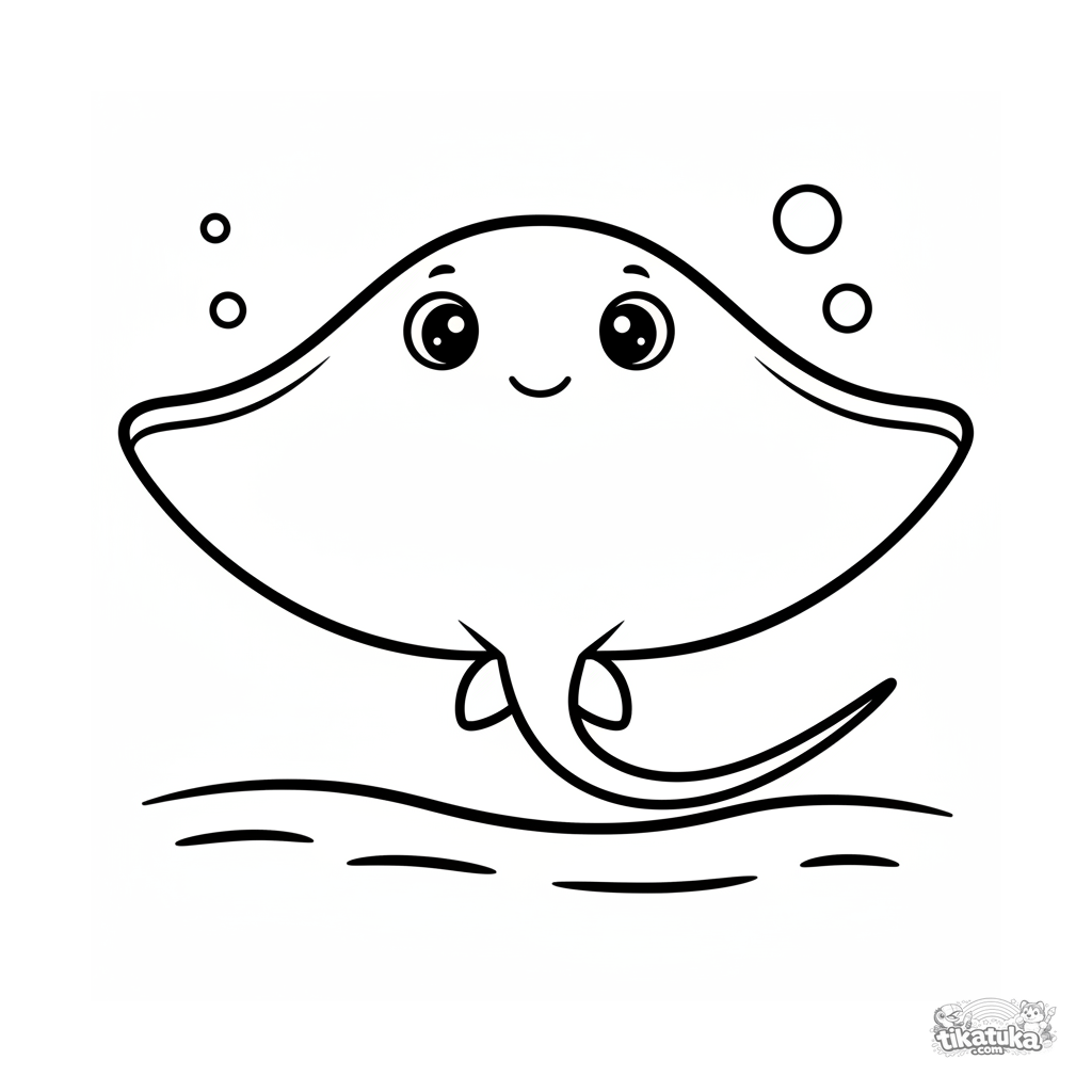 Einfaches Ausmalbild für Kleinkinder: Ein Rochen gleitet über sandigen Grund in Sonnenstrahlen. Große, klare Formen mit breitem Rand. Für 2-3 Jahre.