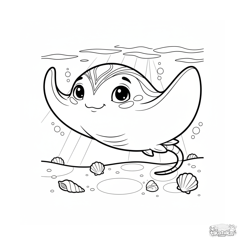 Ausmalbild für Kinder 7-9: Ein anmutiger Rochen gleitet über sonnengewärmten Sand im flachen Wasser. Fließende Art-Nouveau-Lite-Linien.