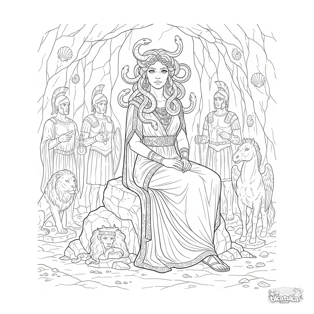 Ausmalbild: Medusa die Gorgone in ihrer steinernen Höhle zwischen versteinerten Statuen. Für Kinder von 10-12 Jahren. Detaillierte Szene mit Höhle, Schlangen und antiken Kriegern.