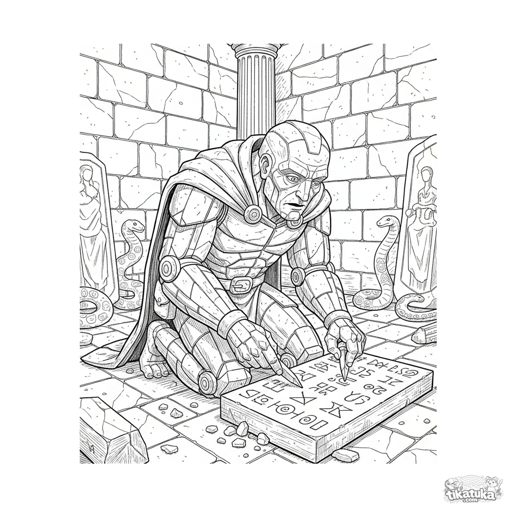 Detailliertes Ausmalbild für Kinder 10-12: Ein mythischer Steinschreiber, der Symbole in der Gorgonenhöhle schnitzt. Stil eines alten Stichs.