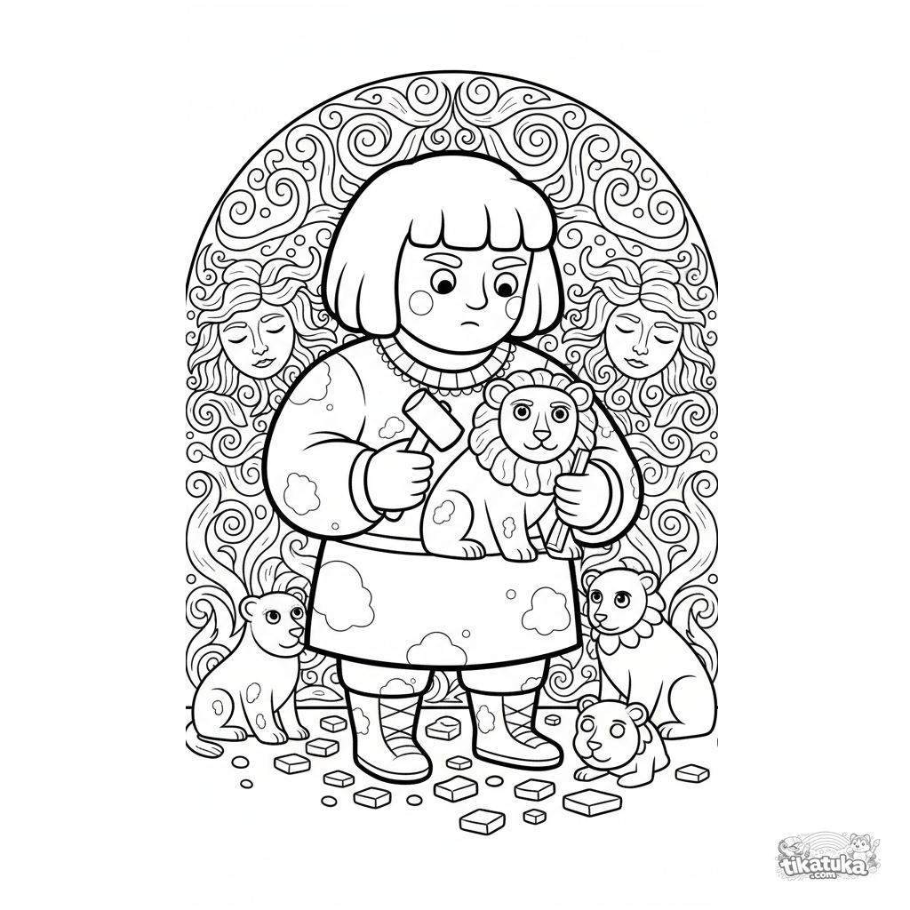 Ausmalbild für Kinder 7-9: Ein Steinbildhauer bei der Arbeit in der Gorgonenwerkstatt.