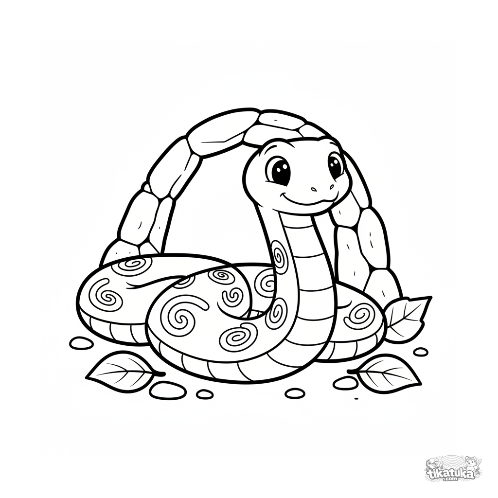 Einfaches Ausmalbild für Kleinkinder 2-3: Eine freundliche Steinschlange mit Spiralmuster bewacht den Höhleneingang. Große, klare Formen zum ersten Ausmalen.