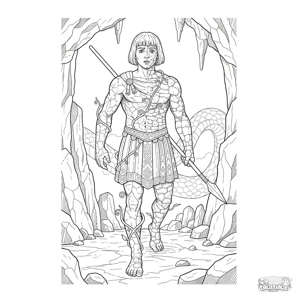 Komplexes Ausmalbild für Kinder 10-12 Jahre: Krieger teilweise durch Medusas Blick zu Stein verwandelt. Texturen von Stein und Fleisch.