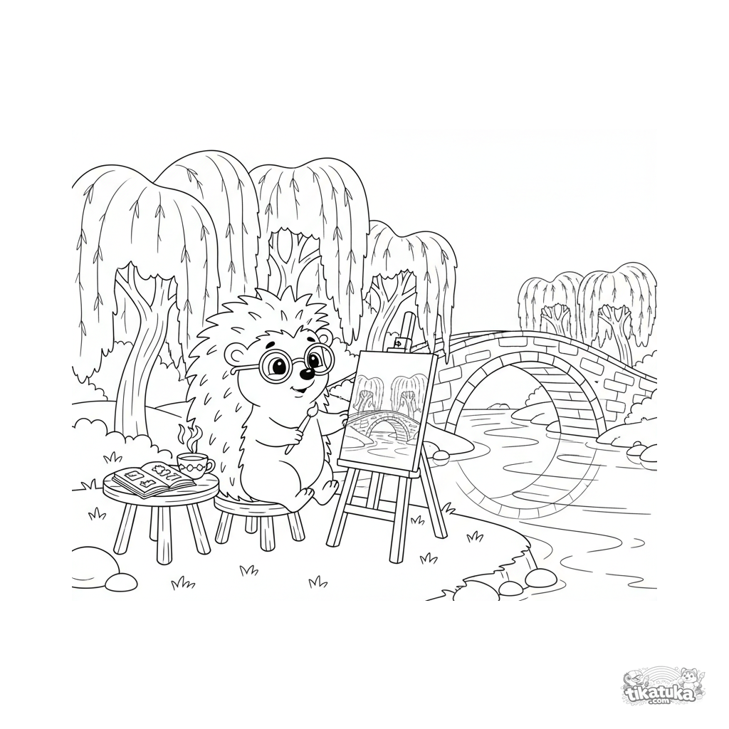 Kinder-Ausmalbild: eine Steinbrücke an einem Fluss und ein Igel-Künstler an einer Staffelei. Weicher Märchenbuch-Stil, ruhige und kreative Atmosphäre.