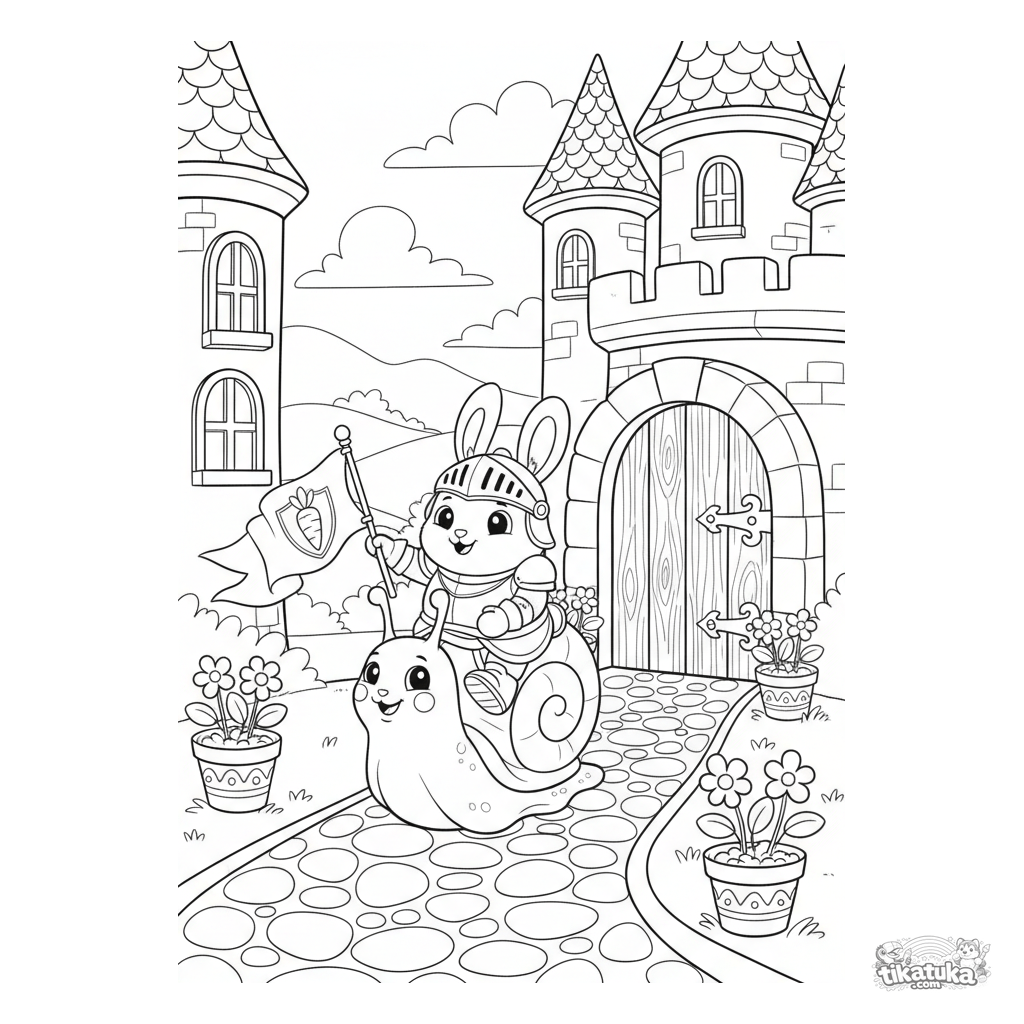 Kinder-Ausmalbild: ein märchenhafter Burghof und ein Kaninchenritter, der auf einer Schnecke ankommt. Weicher Märchenbuch-Stil, einfache und freundliche Formen.