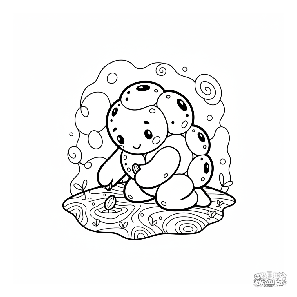 Ausmalbild für Kinder: Eine traubenförmige Mikrobe pflanzt Organellen in einer magischen Zellenwelt. Weicher Märchenbuchstil, Punktaugen, für 4-6 Jahre.