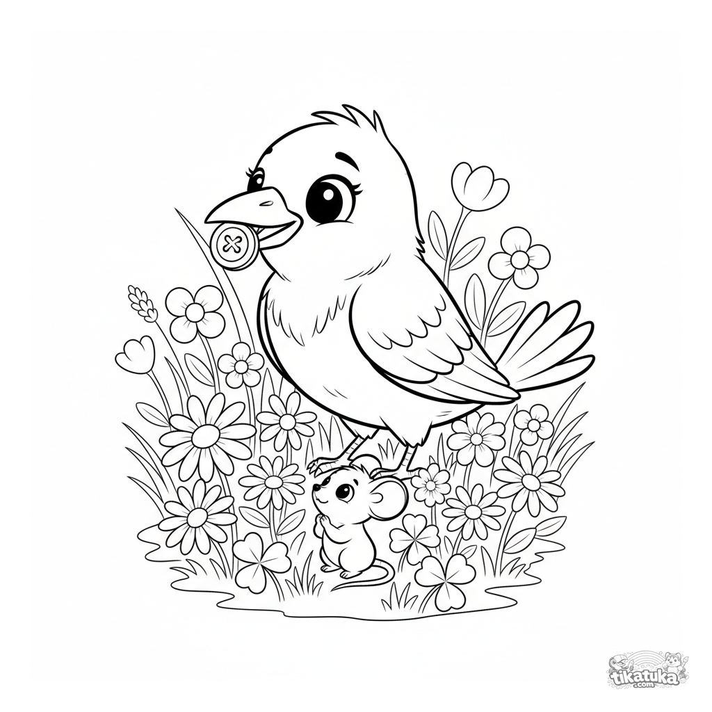 Ausmalbild für Kinder 4-6: Eine Märchenbuch-Krähe hilft einer kleinen Maus, einen verlorenen Knopf auf einer Blumenwiese zu finden. Freundliche Geschichte.