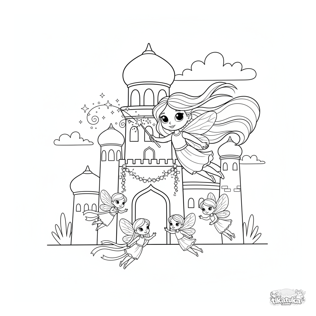 Ausmalbild für Kinder von 4-6 Jahren im Märchenbuchstil: Feen schmücken einen Wüstenpalast auf magische Weise. Anmutige Linien und eine fantastische Szene.