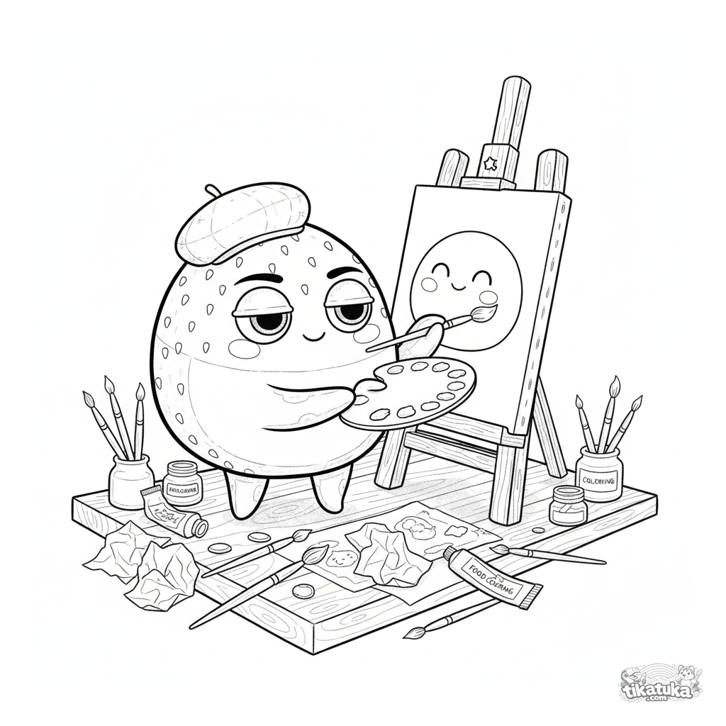 Komplexes Ausmalbild: Ein Erdbeer-Mochi-Künstler malt ein Bild in seinem Studio. Detaillierte Szene im Aquarell-Skizzen-Stil für ältere Kinder 10-12.
