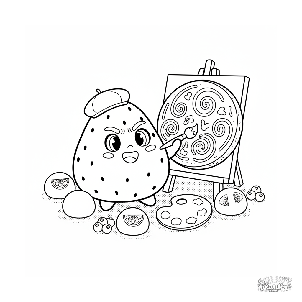 Detailliertes Ausmalbild für ältere Kinder 10-12: ein Erdbeer-Mochi-Künstler mit Baskenmütze malt auf einer Reiskracker-Leinwand. Viele Details für kreatives Ausmalen.