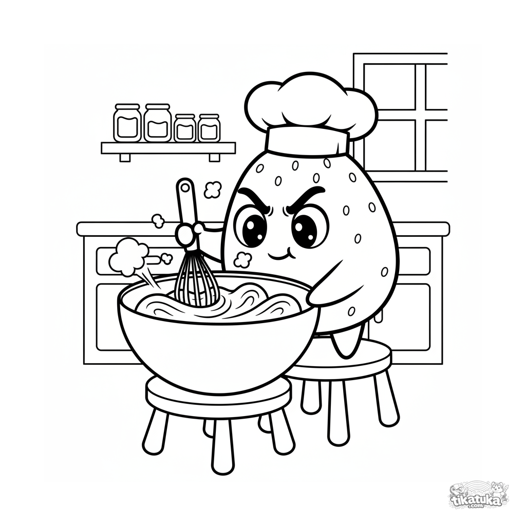 Ausmalbild: Ein Erdbeer-Mochi-Koch mit Hut rührt Teig. Lustige Szene im 90er-Stil für Kinder 4-6.