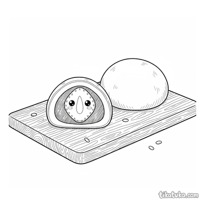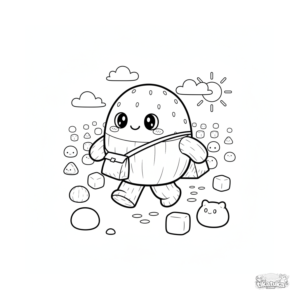 Ausmalbild: Ein Erdbeer-Mochi-Lieferjunge marschiert durch ein Mochi-Feld. Dynamische Szene im Spielzeugstil für 7-9 Jahre.