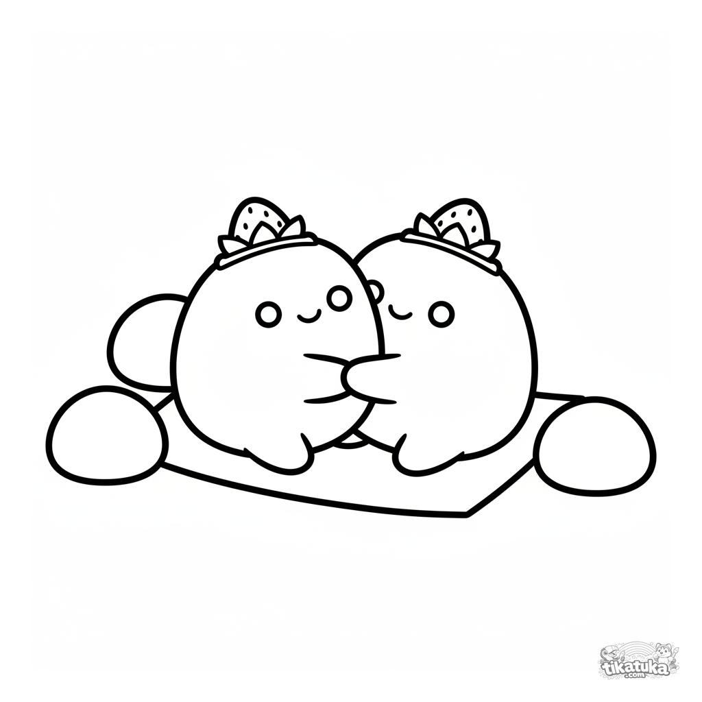 Ausmalbild für Kleinkinder: Zwei süße Erdbeer-Mochi umarmen sich auf einem Reispapierblatt zwischen anderen Mochi. Einfache Formen und breite Ränder.