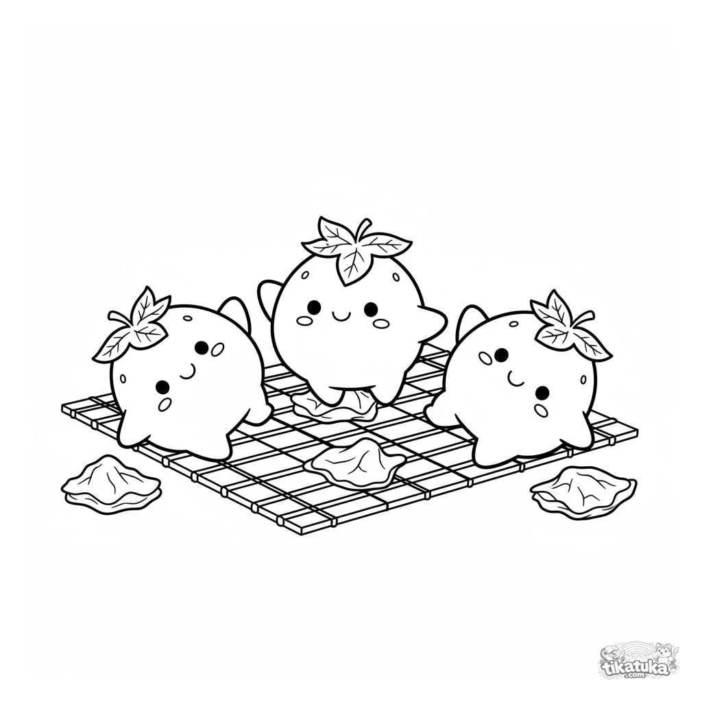 Ausmalbild mit drei süßen Erdbeer-Mochi, die auf einer Matte balancieren. Kawaii-Stil für Kinder 4-6. Kostenlos druckbar.