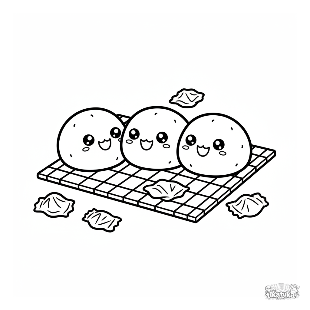 Ausmalbild für Kleinkinder: drei niedliche Erdbeer-Mochi auf einer Bambusmatte. Einfache Formen und breite Ränder.