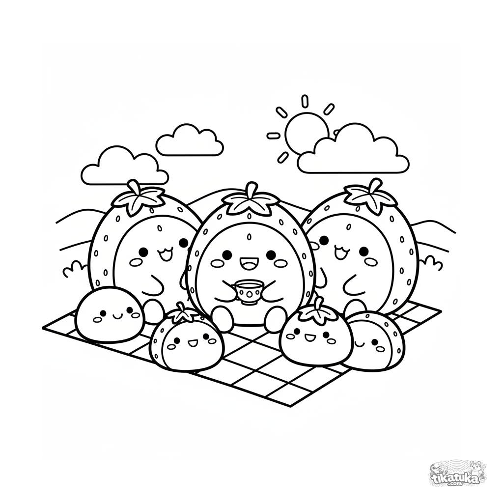 Ausmalbild mit niedlichen Erdbeer-Mochis beim Picknick. Für Kinder 4-6 Jahre. Drei Mochis mit Blatthüten auf einer karierten Decke.