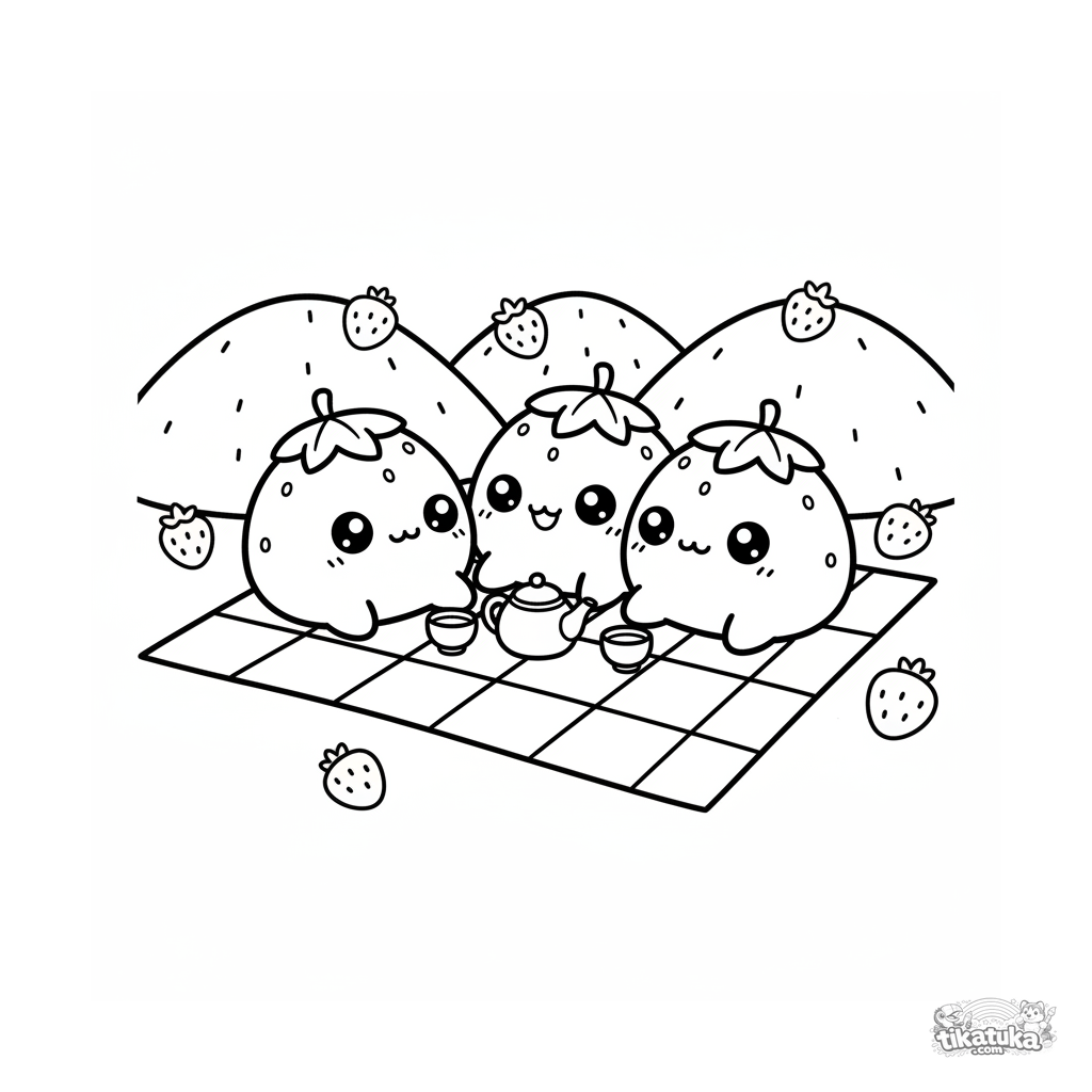 Ausmalbild von drei Erdbeer-Mochi beim Picknick. Niedliche Szene für Kinder von 4-6 Jahren.
