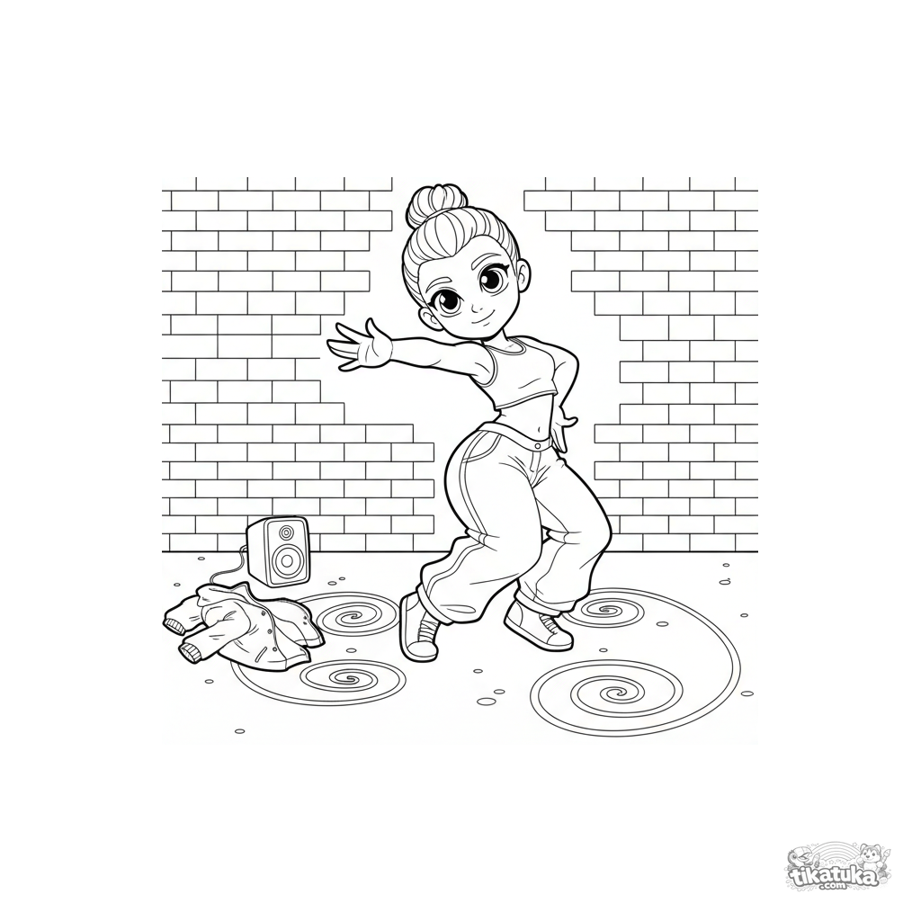 Ausmalbild für Kinder von 7-12 Jahren: Ein Streetdancer hält eine dynamische Freeze-Pose in einer Backsteinstadtgasse. Szene mit detaillierter Kleidung, einem Lautsprecher und urbanen Elementen.