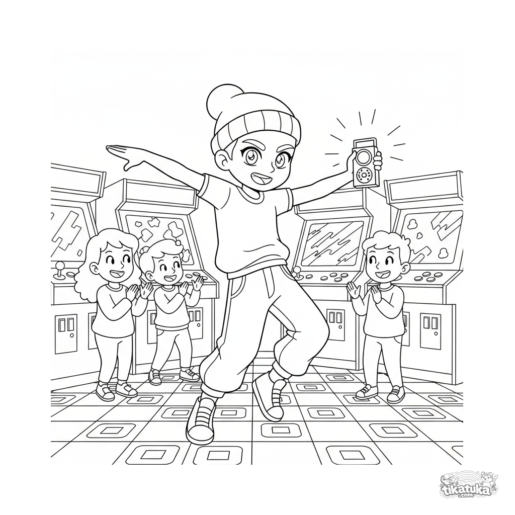 Ausmalbild für Kinder von 7-12 Jahren: ein Street-Dancer in einer dynamischen Drehbewegung in einer Arcade-Raum-Ecke mit Publikum.