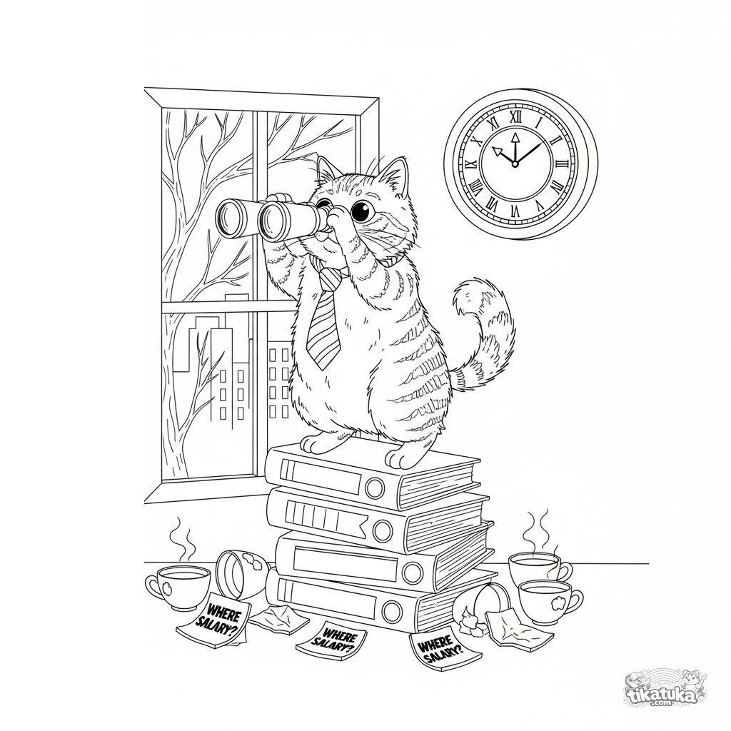 Detailliertes Ausmalbild für Kinder 10-12: Eine gestresste Bürokatze auf einem Ordner-Turm versucht, mit dem Fernglas das Gehalt zu erspähen. Lustiges, detailliertes Meme mit Kaffeetassen und Haftnotizen.