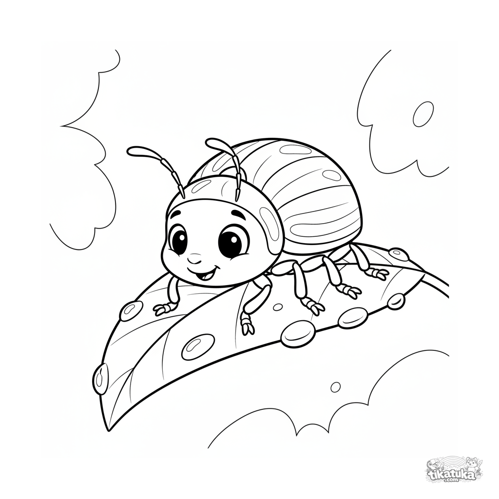 Ausmalbild eines gestreiften Käfers, der vorsichtig auf einem großen Blatt mit Tautropfen läuft. Für Kinder von 4-6 Jahren.