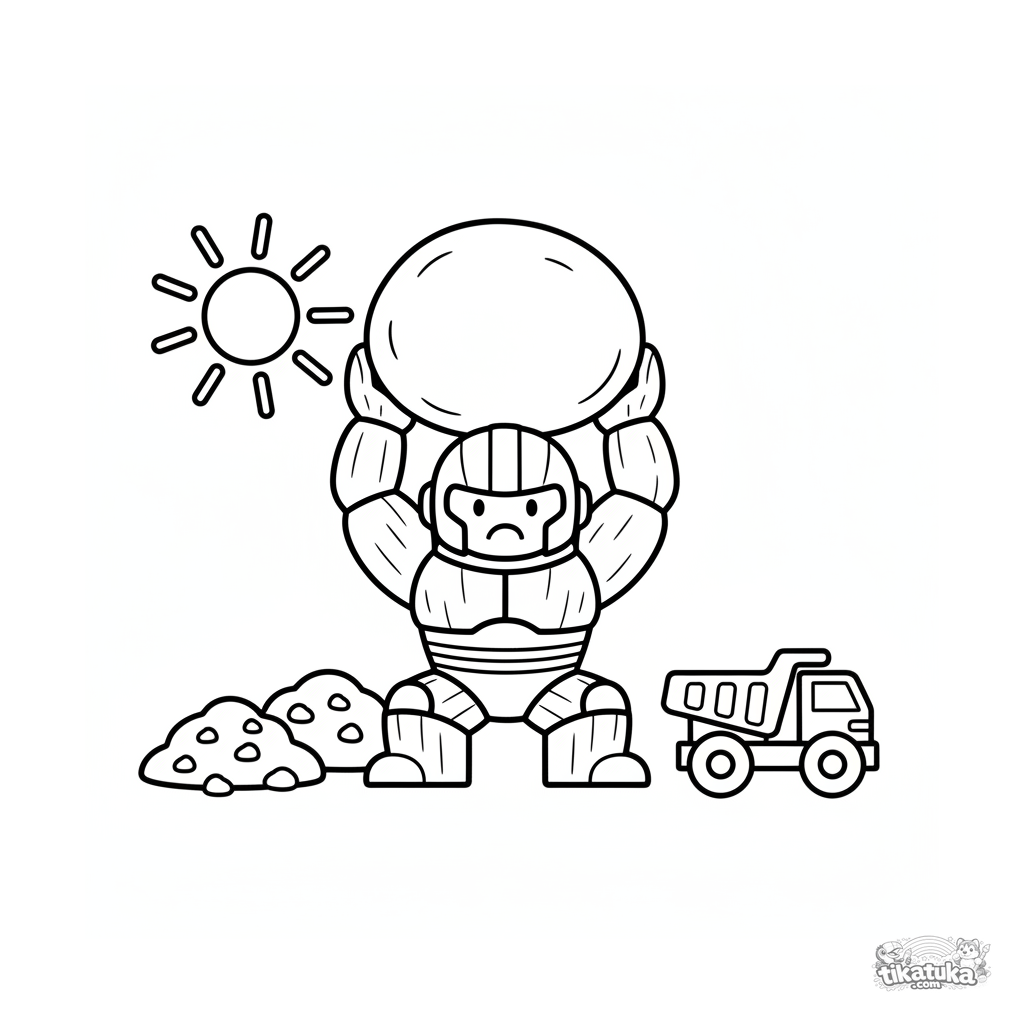Einfaches Ausmalbild für Kleinkinder 2-3: Ein starker Superheld im Holzspielzeug-Stil hebt einen großen runden Felsbrocken auf einer Baustelle. Große, klare Formen, breite Ränder.
