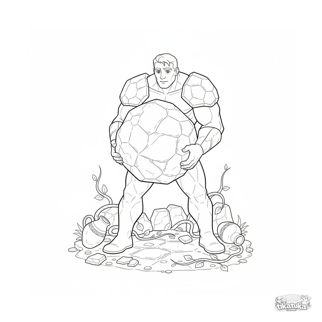 Ausmalbild für 10-12 Jahre: Ein Stärke-Superheld in steinartiger Rüstung hebt einen Felsbrocken, um einen Weg in überwucherten antiken Ruinen frei zu machen. Realistische, detaillierte Szene.