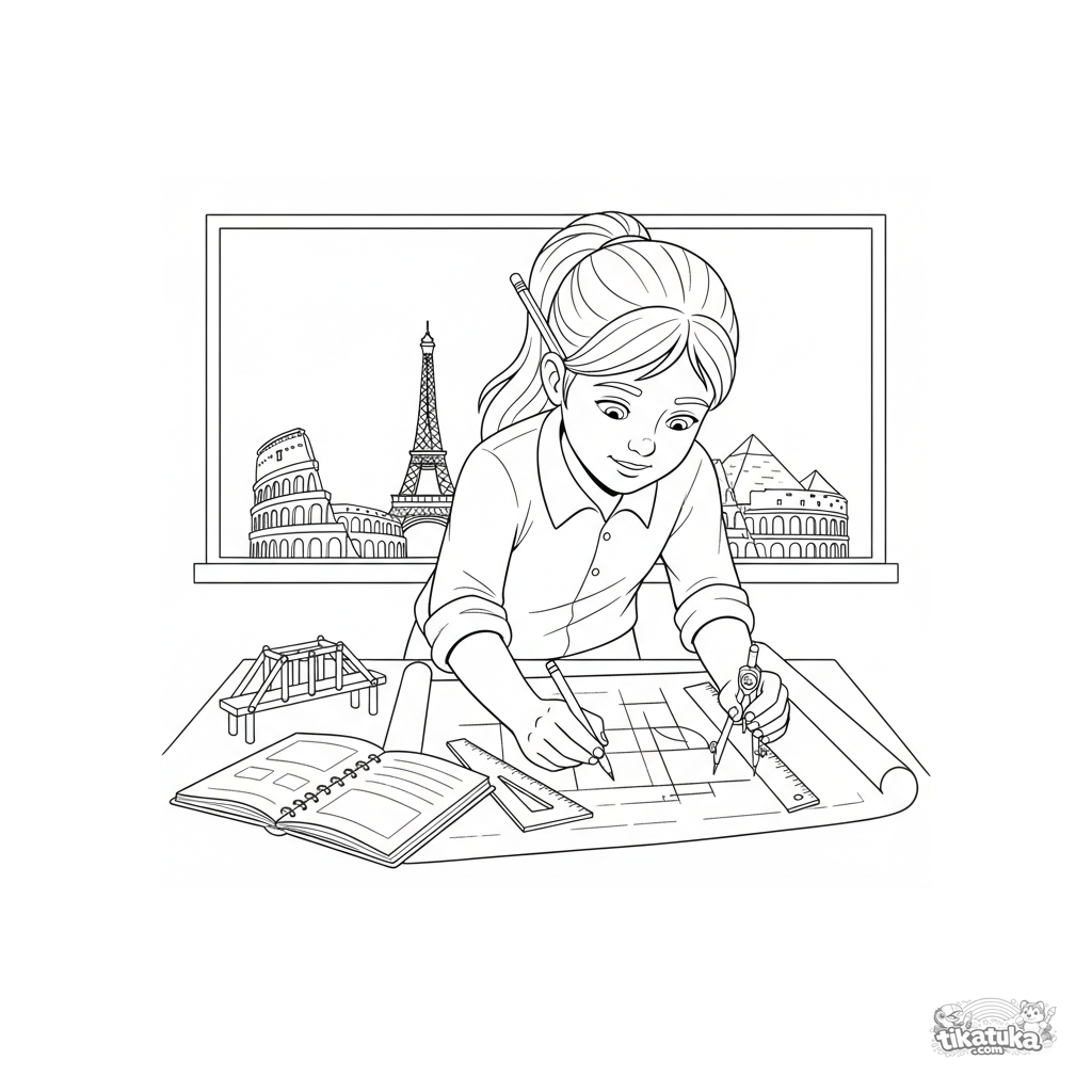 Ausmalbild für Kinder 7-9: Ein konzentrierter Schüler-Architekt zeichnet einen detaillierten Bauplan mit Lineal und Zirkel am Klassenzimmertisch, vor einer Tafel mit Gebäudeskizzen.