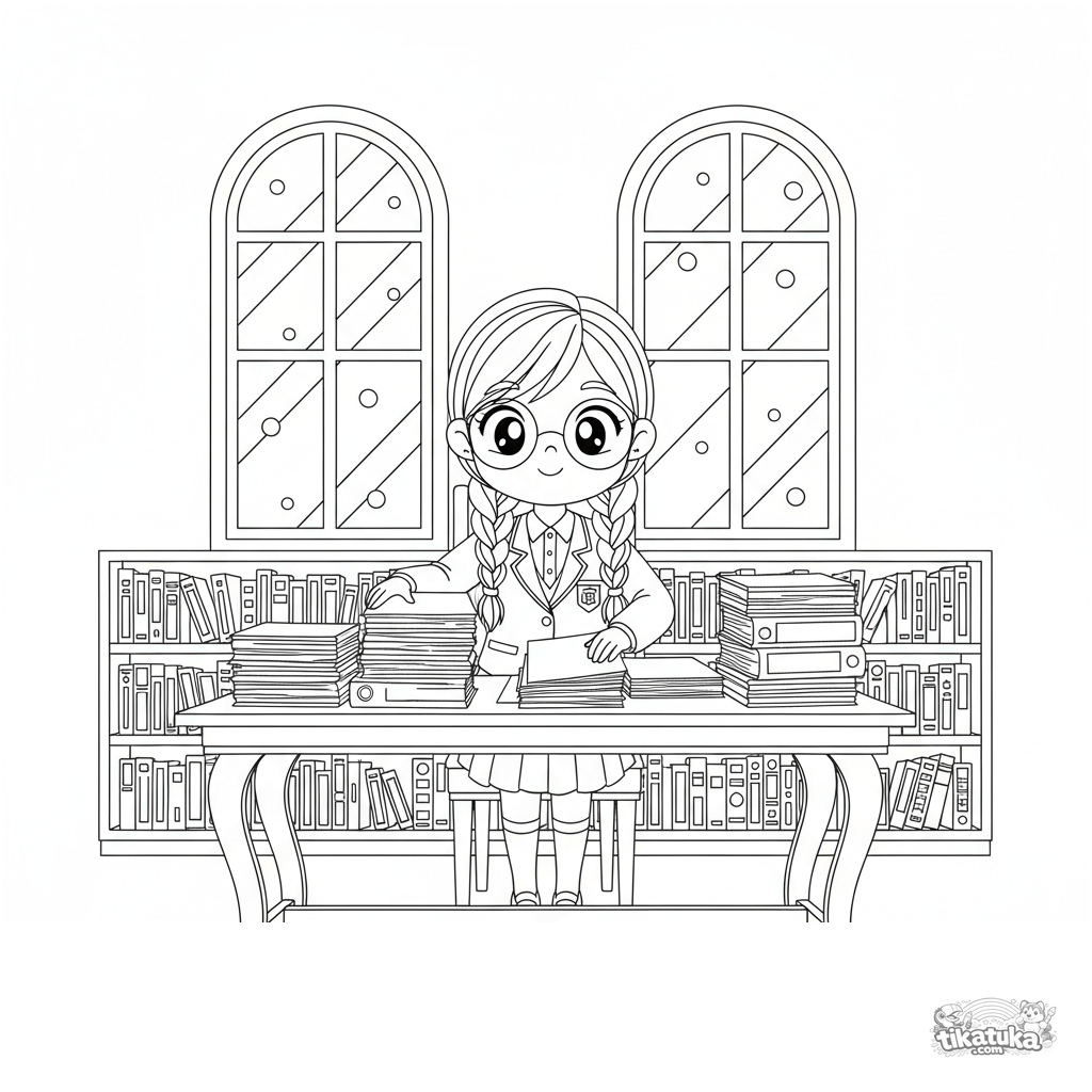 Detailliertes Schul-Anime-Ausmalbild: Eine Schülerratspräsidentin arbeitet in der Bibliothek. Komplexe Szene mit Büchern und Sonnenlicht für ältere Kinder von 10-12 Jahren.