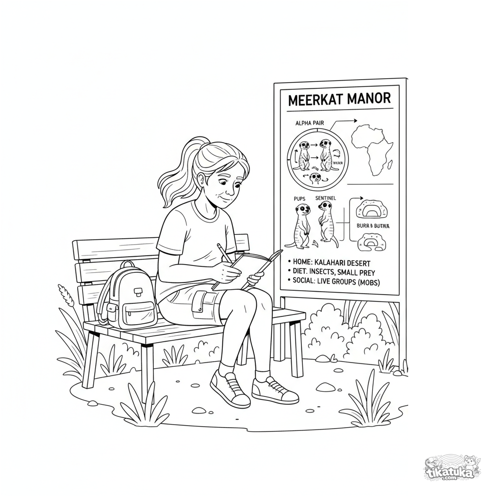 Detailliertes Ausmalbild für Kinder 10-12 Jahre. Ein Student zeichnet eine Infotafel mit einem Erdmännchen-Familiendiagramm auf einer Zoo-Bank.
