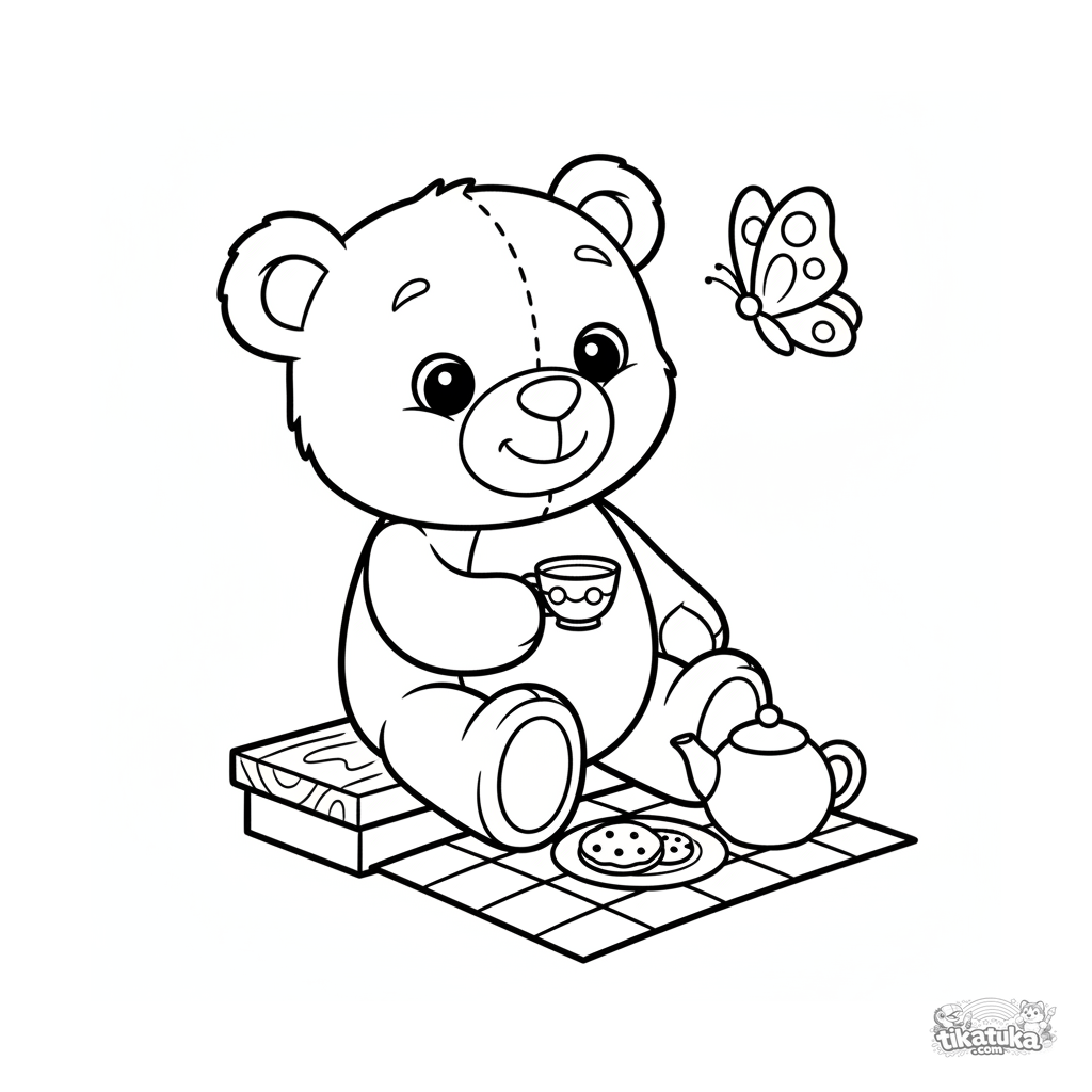 Einfaches Ausmalbild für Kleinkinder 2-3: Ein großer Stoffteddy sitzt auf einer Verandastufe und trinkt Tee. Große Formen, wenige Details, breite Ränder zum Ausmalen.
