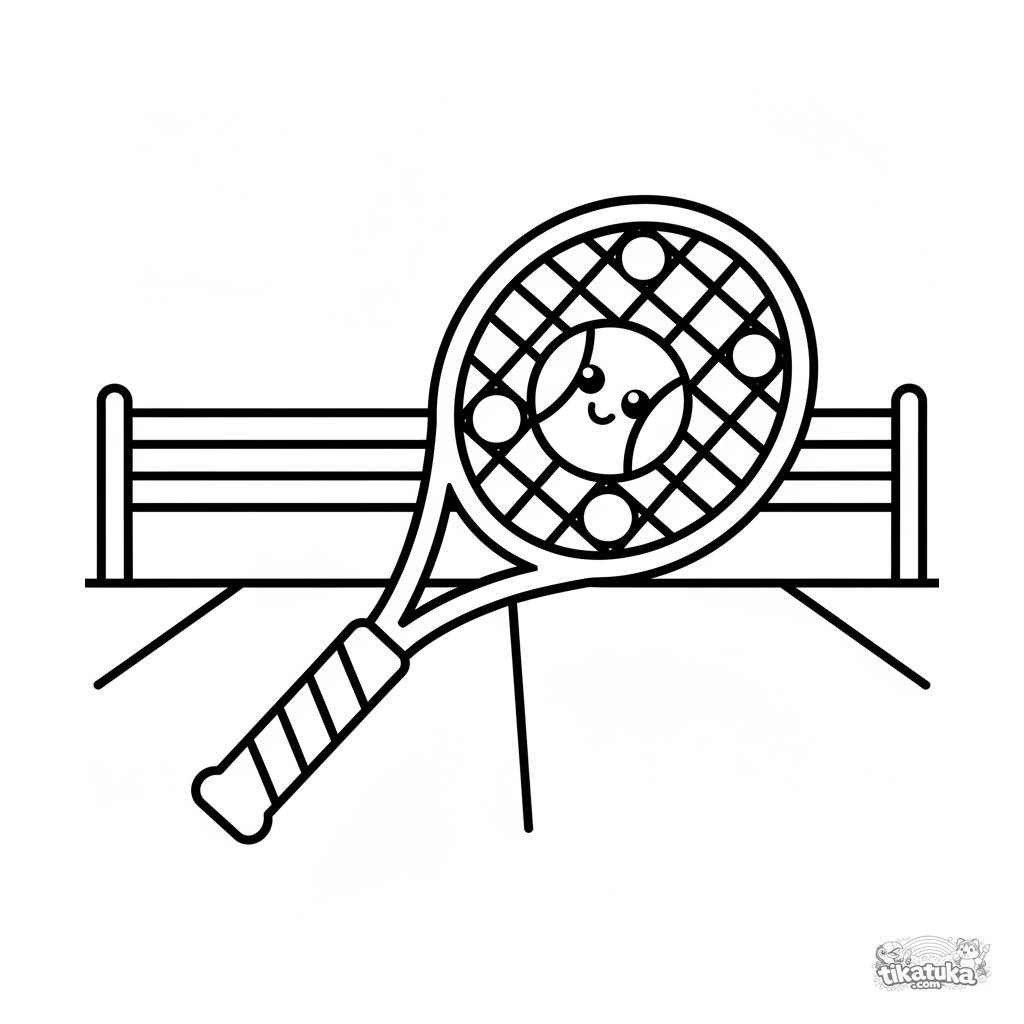 Sehr einfaches Ausmalbild für Kleinkinder 2-3 Jahre: ein großer stylisierter Schläger und ein lächelnder Ball auf den Platzlinien.