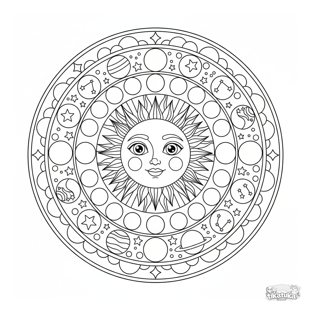 Detaillierte himmlische Sonne-und-Mond-Mandala zum Ausmalen für 10-12 Jährige. Sonnengesicht, Mondphasen, Ring aus Sternen und Sternbildern, vierfache Symmetrie.