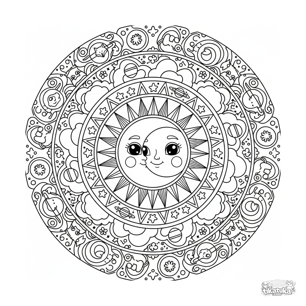 Komplexes Himmelsmandala-Ausmalbild für 10-12 Jahre. Zentrale Sonne und Mond, Ringe aus Strahlen, Wolken, Sternen und Planeten. Weltraum-Thema, hohe Detailtreue.