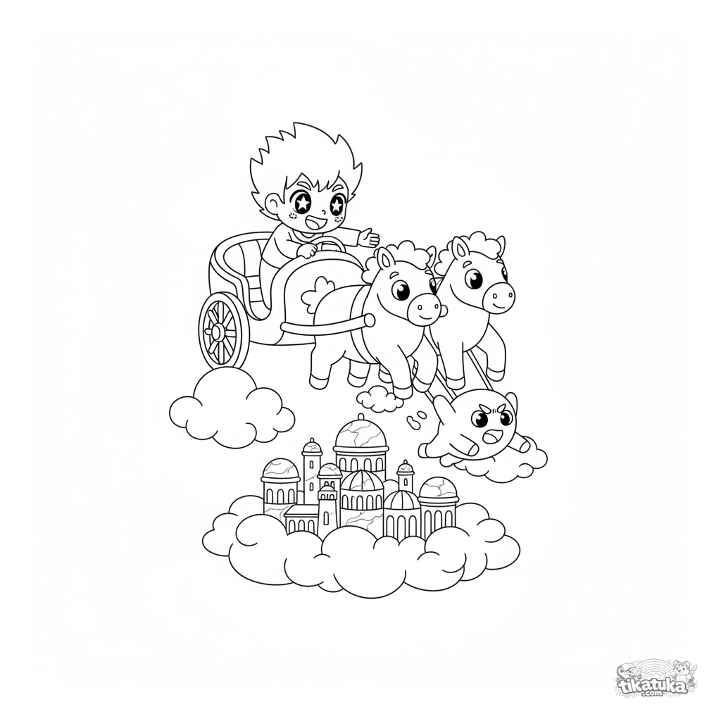 Ausmalbild für Kinder: Ein fröhlicher Lenker auf einem Sonnenwagen hilft Wolkengeistern. Eine dynamische und freundliche Szene, geeignet für Kinder von 5-9 Jahren.