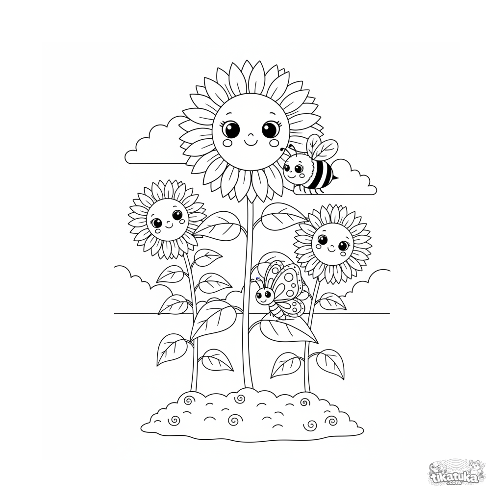 Ausmalbild für Kinder 4-6: Ein sonniges Feld mit Sonnenblumen, einer Biene und einem Schmetterling. Ausgewogene Details und klare Formen.