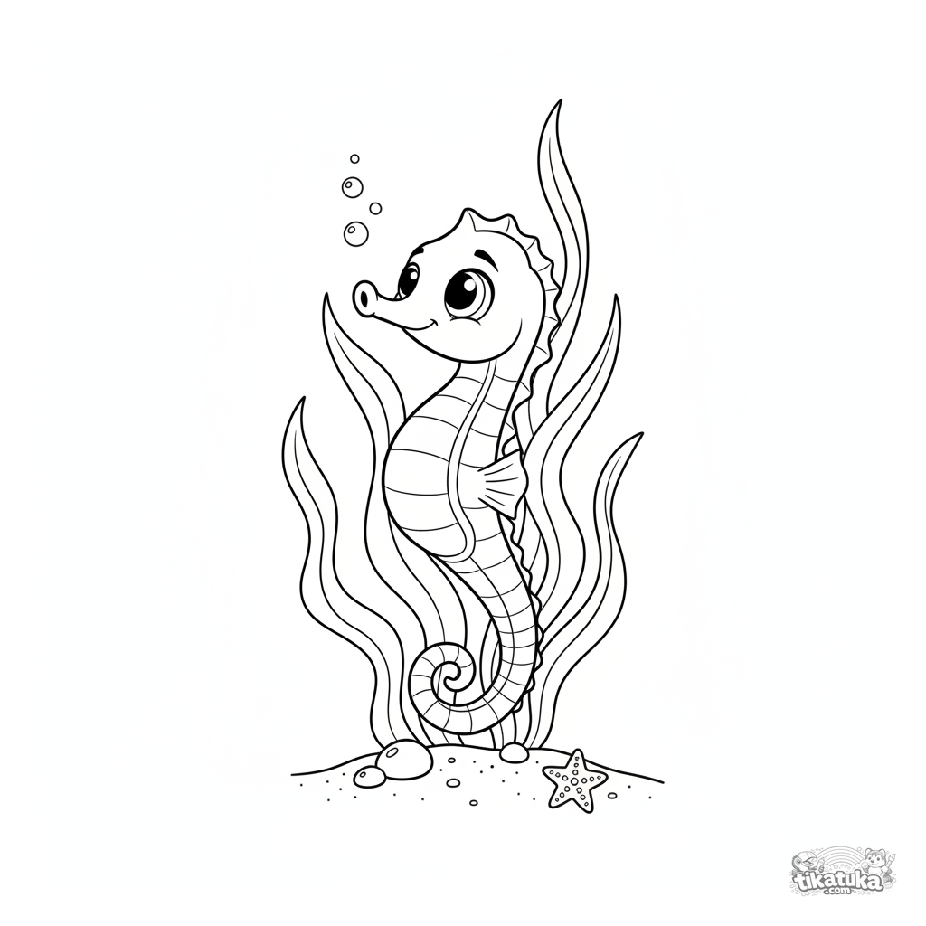 Ausmalbild für Kinder 4-6: Ein Seepferdchen hängt an Seegras im sonnenbeschienenen Flachwasser. Einfache Formen, freundlicher Ausdruck.