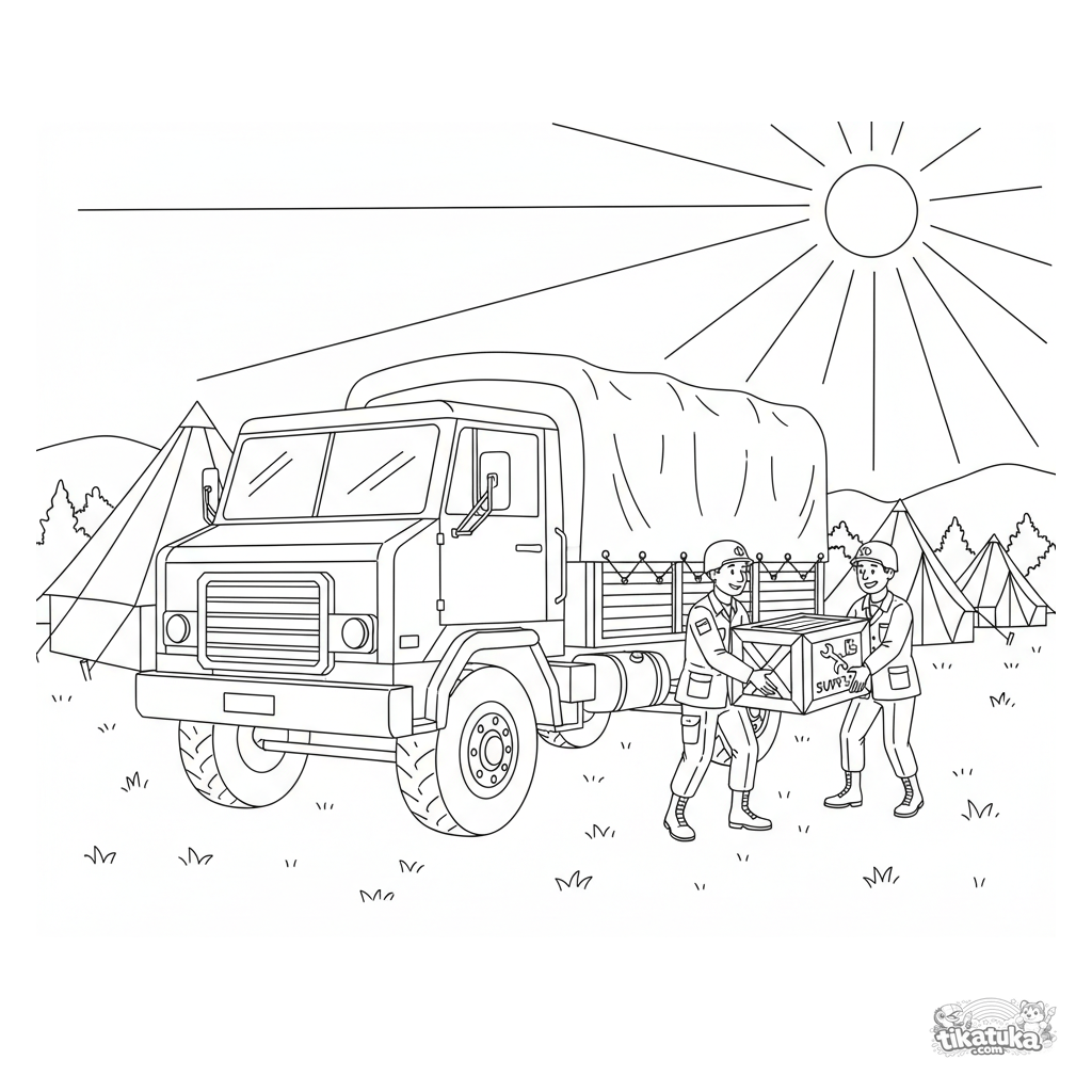 Detailliertes Ausmalbild für 10-12 Jahre: Ein Militärversorgungslaster entlädt Kisten an einem Feldhauptquartier. Szene mit Soldaten, Zelten und Kistenmarkierungen.