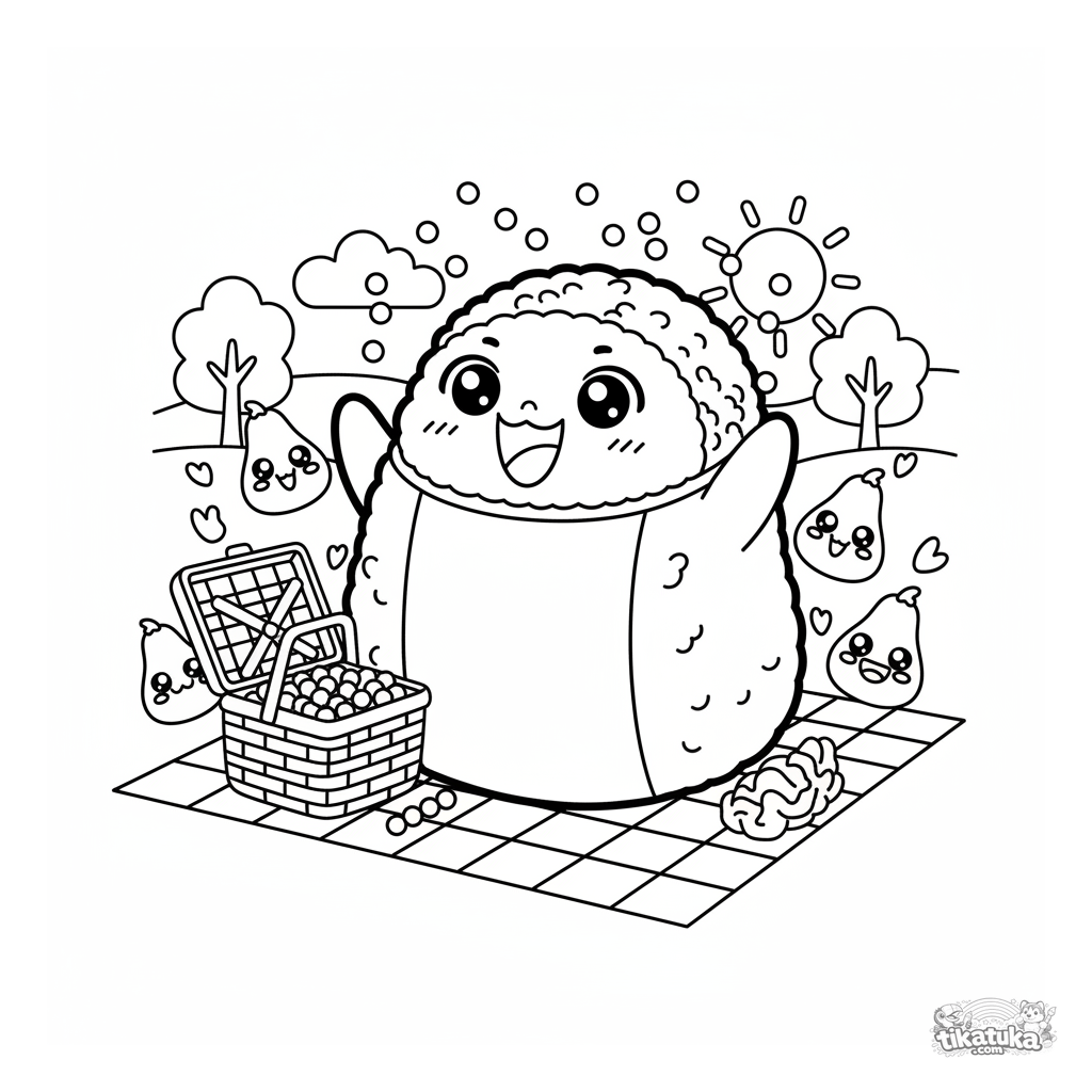Ausmalbild einer Sushi-Rolle, die an einem Picknickkorb Fischrogen-Konfetti wirft. Für Kinder von 4-6 Jahren. Mit Nori, Reis, Sojasoße-Päckchen und Ingwerscheiben.