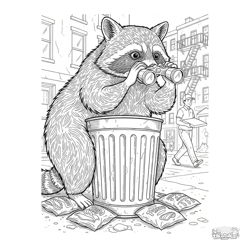 Ausmalbild für Kinder 10-12: Ein verdächtiger Waschbär in einer Mülltonne mit Fernglas beobachtet eine Pizza-Lieferung in einer Stadtgasse. Detailliertes humorvolles Meme.