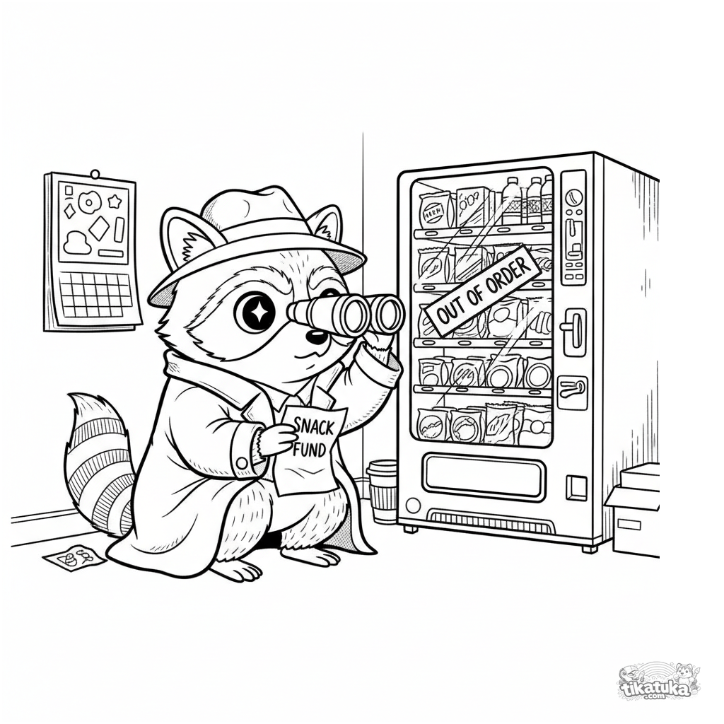 Komplexes Ausmalbild im Graphic-Novel-Stil für Kinder 10-12: Ein verdächtiger Waschbär-Spion im Trenchcoat beobachtet einen kaputten Getränkeautomaten. Detailliertes lustiges Meme.