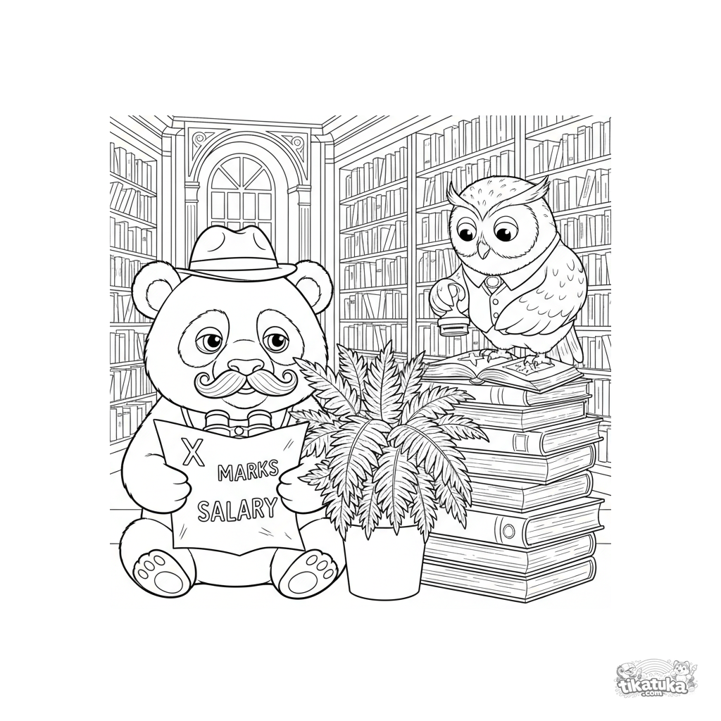 Detailliertes Ausmalbild im Graphic-Novel-Stil: Ein verdächtiger Kleiner Panda-Spion in einer Bibliothek stellt dem Gehalt nach. Lustiges Meme mit Karte, Eulen-Bibliothekarin und Farn als Versteck.